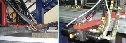 聚氨酯組分原料經(jīng)過連續(xù)高壓發(fā)泡機的計量泵精密計量后,按照一定配比,被送入混合頭均勻地布料在復(fù)合板的底層面材上,并和上層面材同時被送入雙履帶層壓輸送機,聚氨酯泡沫在雙履帶層壓輸送機的上下輸送鏈板間發(fā)泡,并固定成型。待固定成型后,復(fù)合板在生產(chǎn)線上被自動跟蹤,切斷機按需切成一定長度的成品。